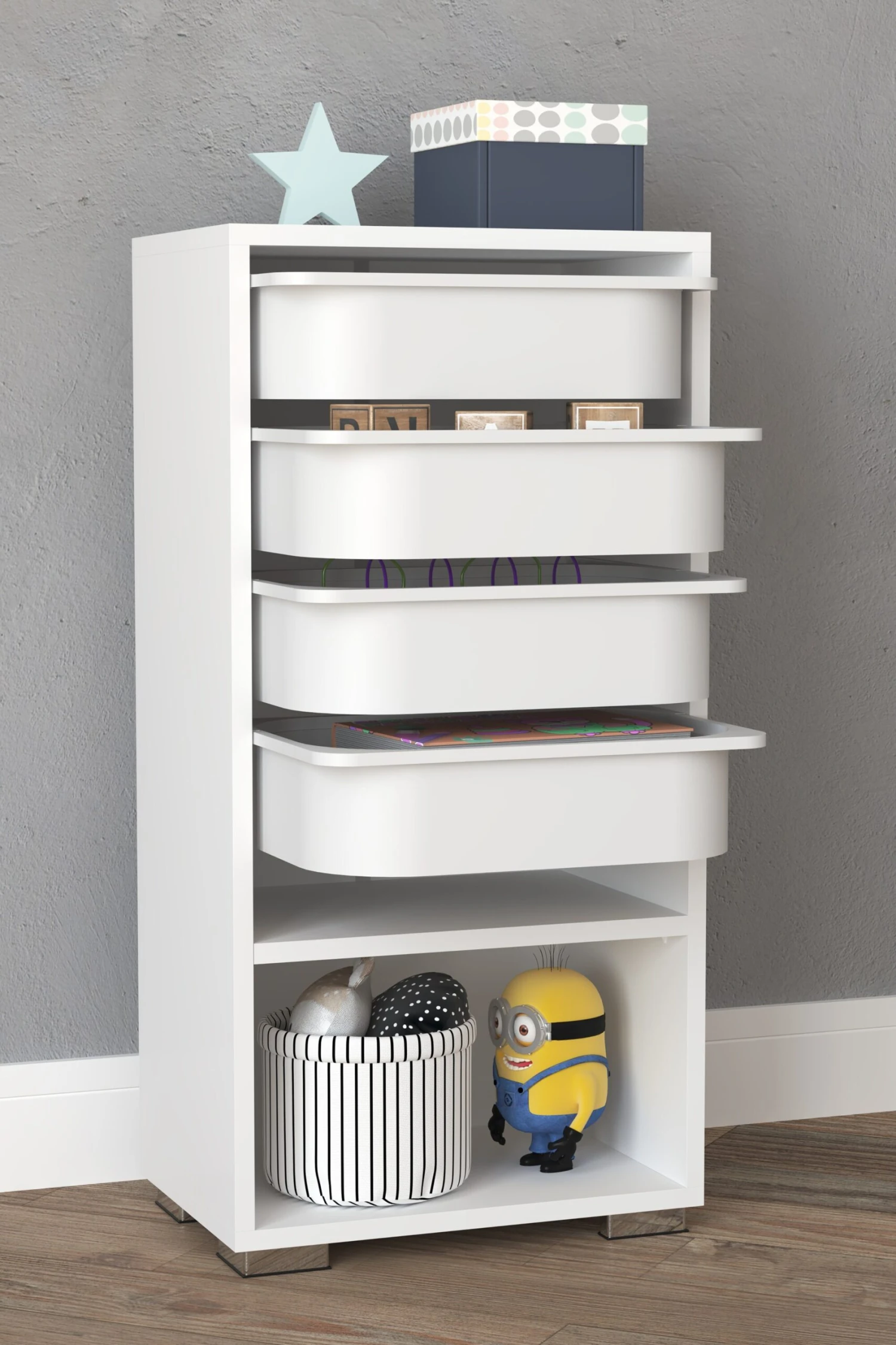 Die praktischen Schubboxen und ein zusätzliches, offenes Fach, bieten ausreichend Platz für Sammelschätze oder weitere Utensilien.