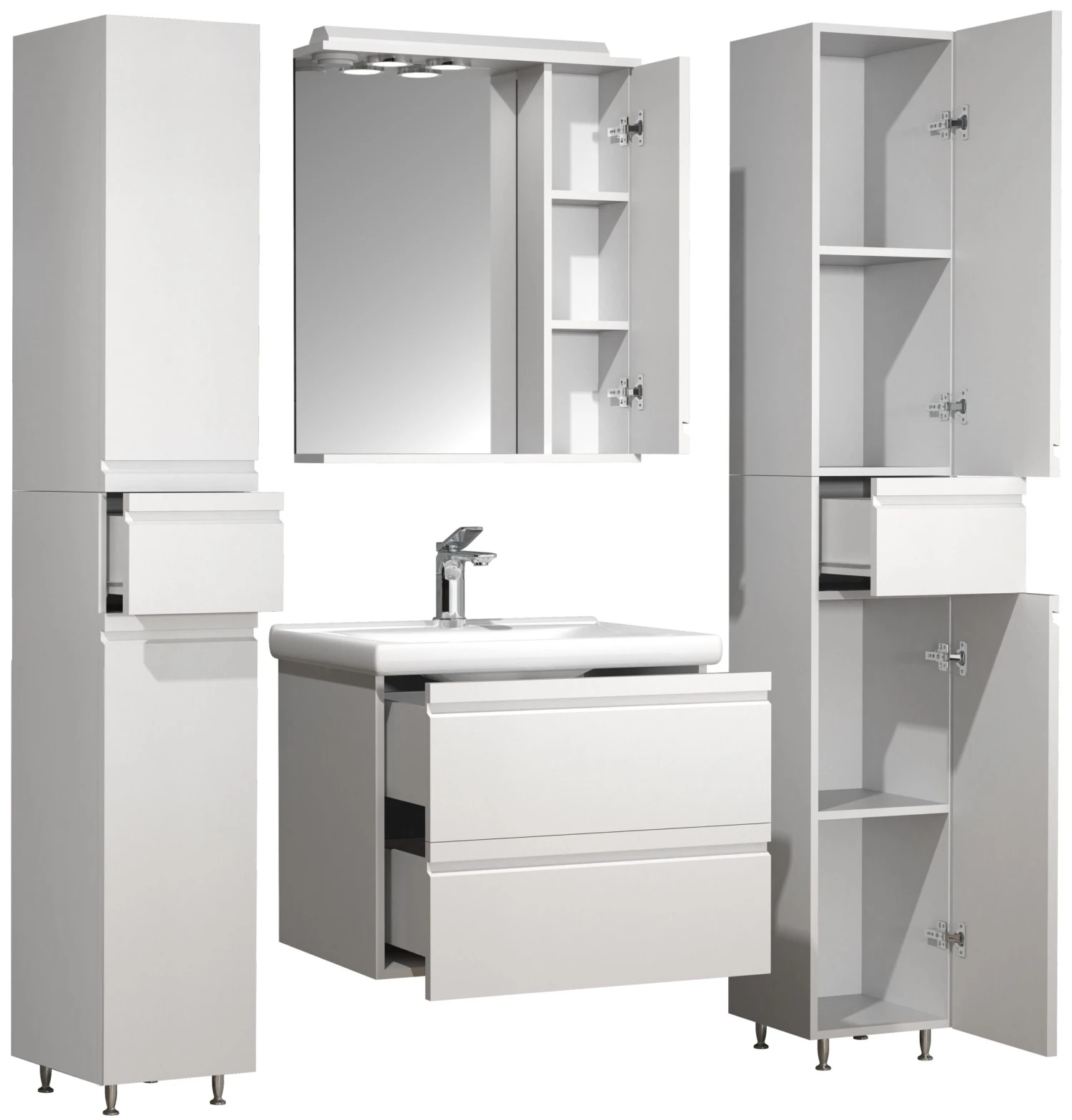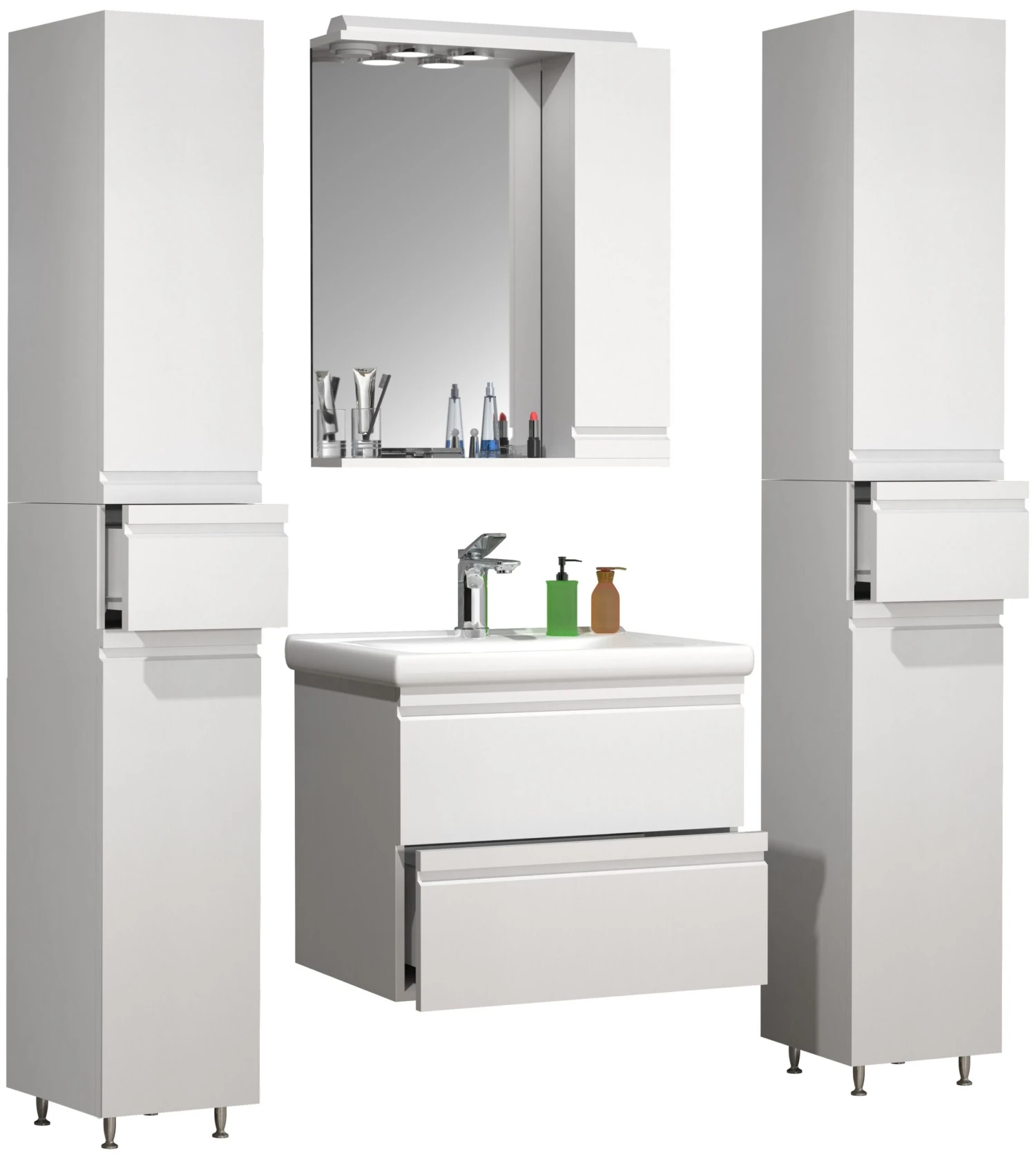 Das VCM Badmöbel-Set „Silora“ besteht aus einem Unterschrank mit zwei Schubladen und einem Waschbecken aus massiver Keramik, sowie einem Spiegelschrank und zwei Hochschränken.