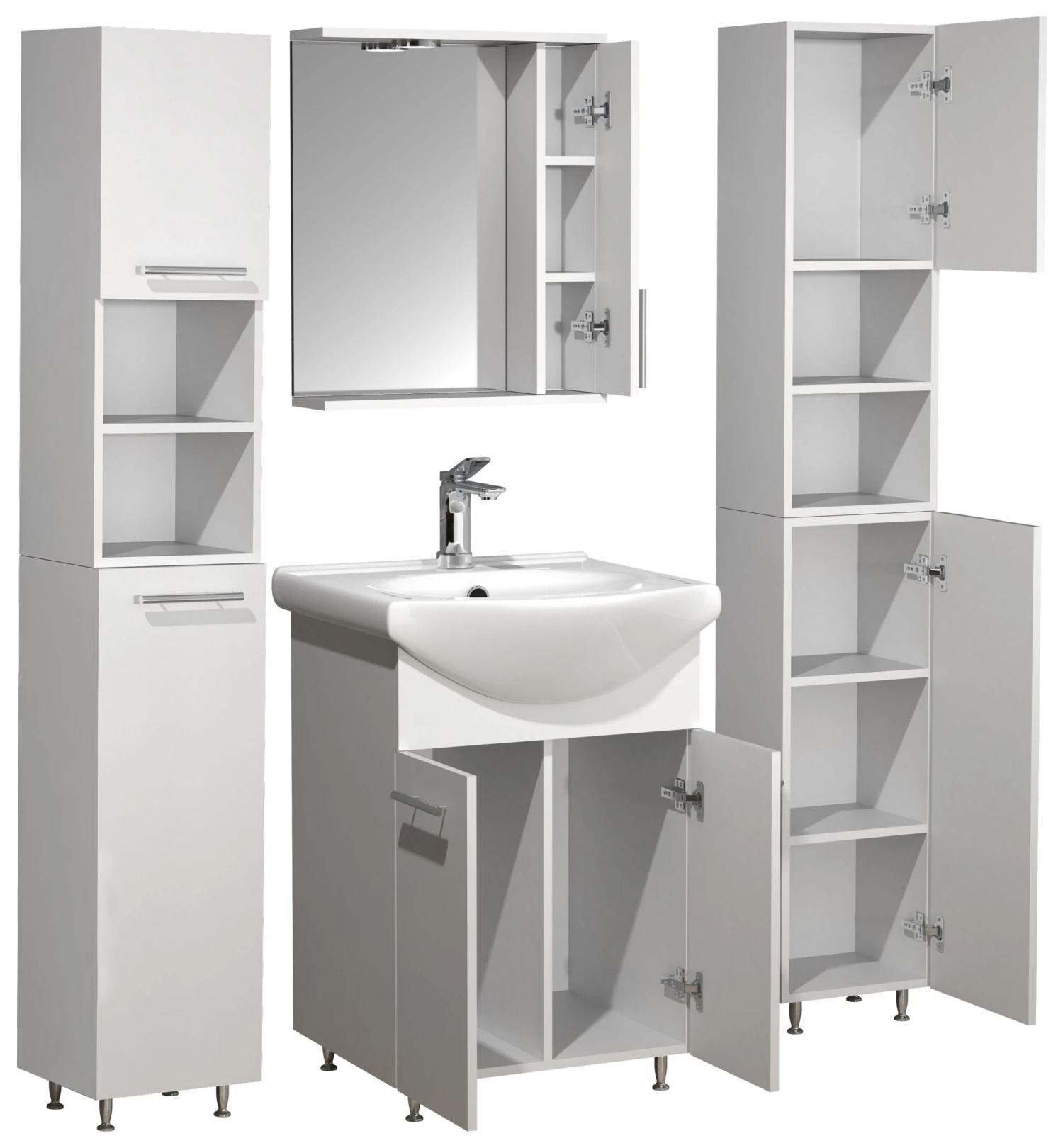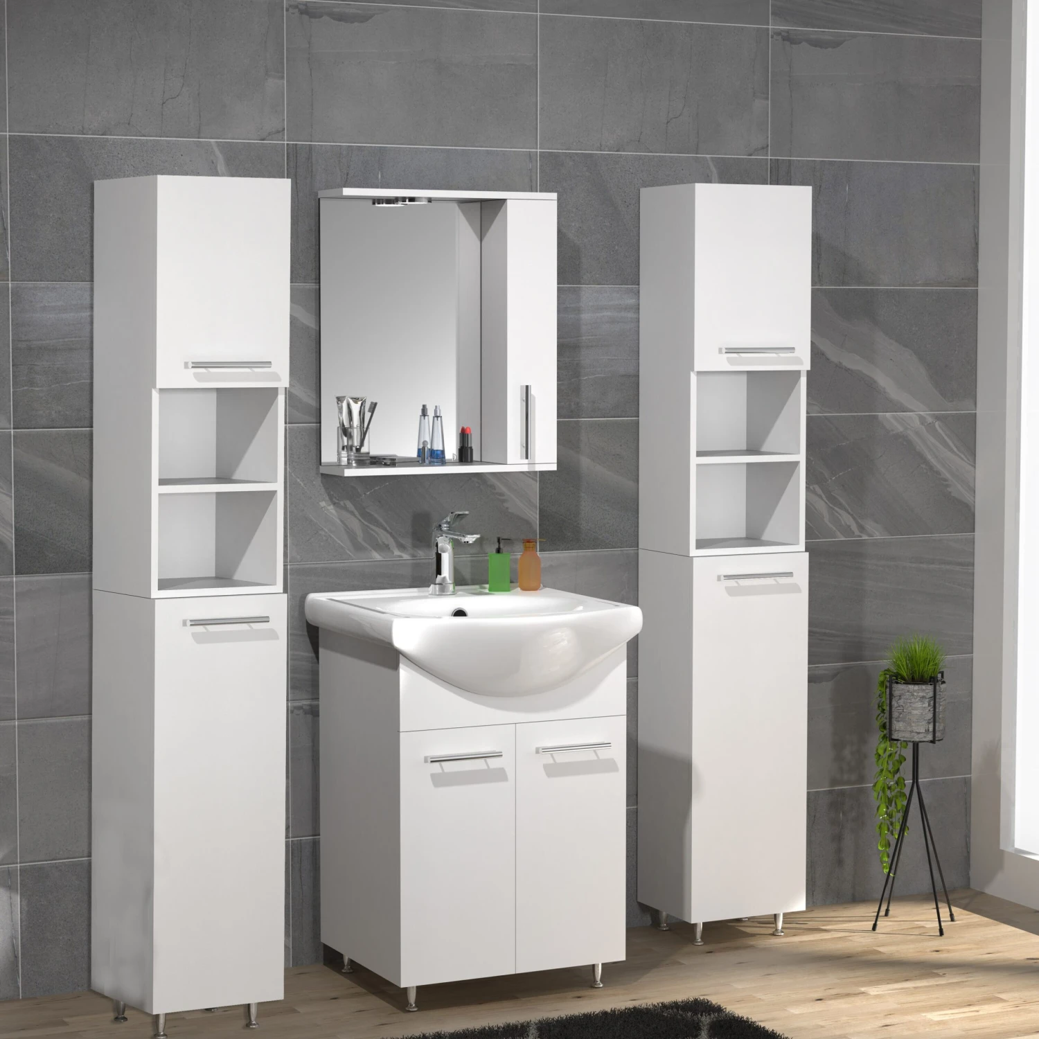 Das VCM Badmöbel-Set „Lisalo“ besteht aus einem Unterschrank und einem Waschbecken aus massiver Keramik. Der Designer hat sich bewusst für ein gewölbtes Waschbecken entschieden, da es den Komfort erhöht. Der Unterschrank hat zwei große Drehtüren und bietet praktischen Stauraum. Das Ablagefach und die Drehtür am Spiegel bieten weiteren Platz für die perfekte Ordnung im Alltag.