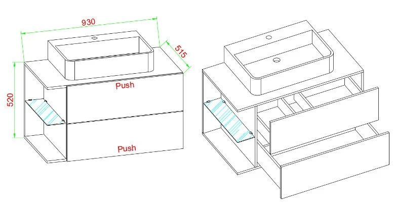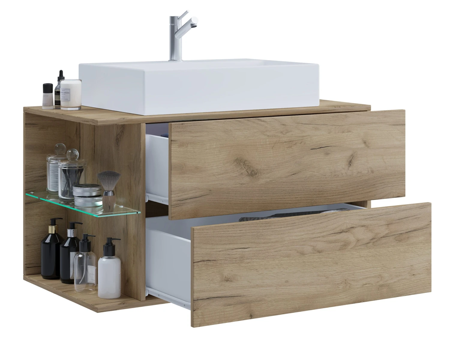 Der Waschbeckenunterschrank wirkt durch die offenen Seitenfächer und dem Glasboden besonders elegant. Die Schubladen mit der push-to-open Funktion sind ebenso ein absolutes Highlight.