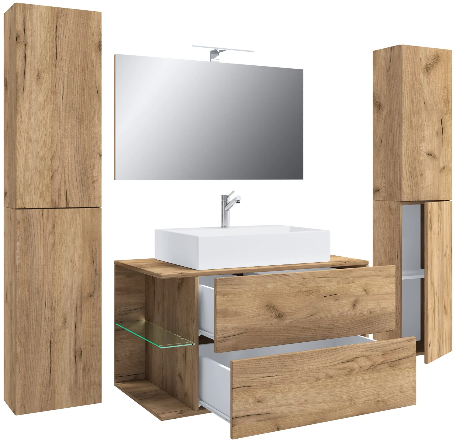 Das VCM Badmöbel-Set „Hausa“ besteht aus einem Unterschrank, zwei Hochschränken, einem Waschbecken aus massiver Keramik und einem Spiegel.