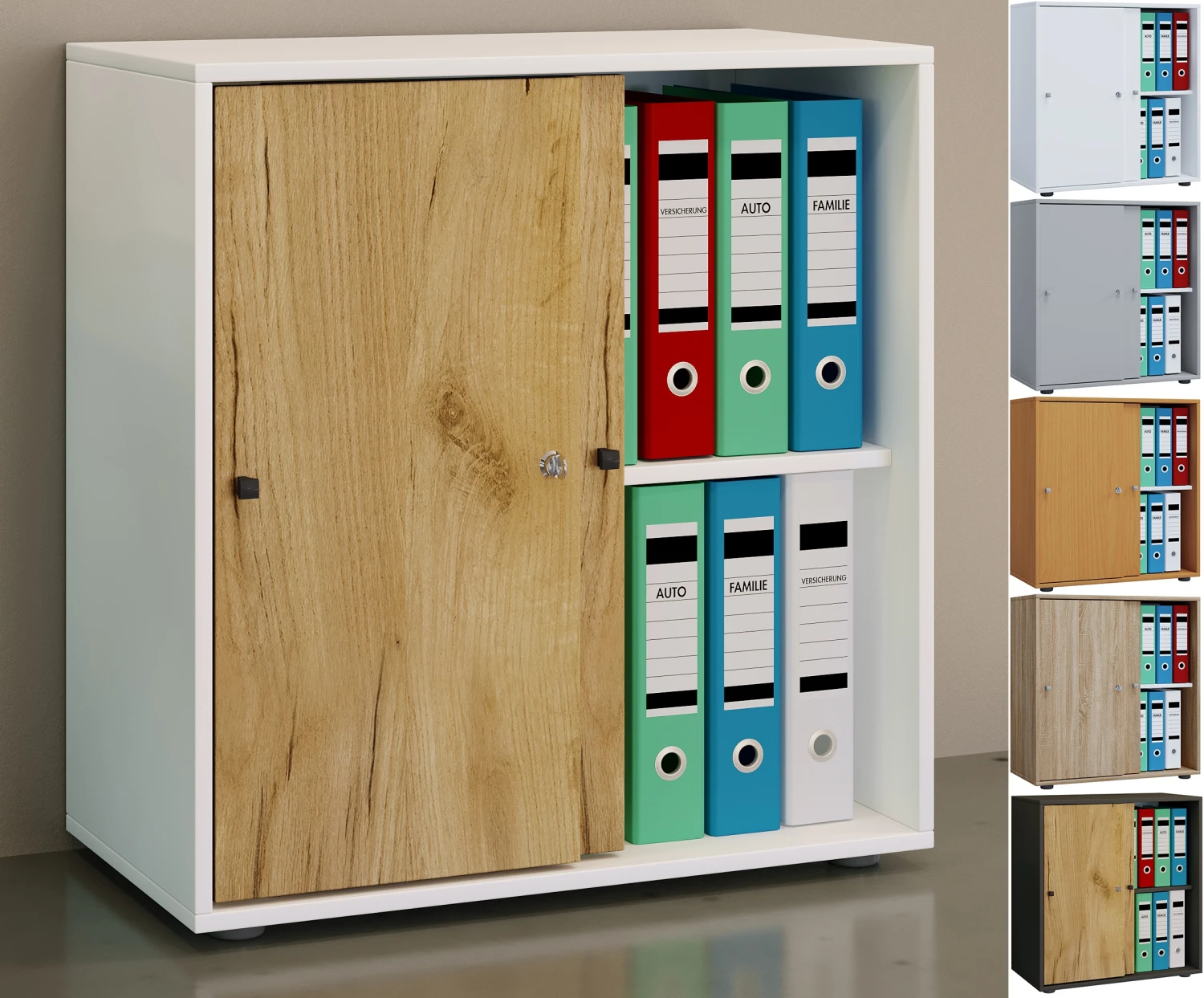 Der VCM Büroschrank „Lona L mit abschließbaren Schiebetüren“ hat einen variablen Fachboden und Platz für 14 Aktenordner und andere Utensilien. Der Korpus besteht aus einer Holzstruktur-Nachbildung und besitzt eine stabile Rückwand.