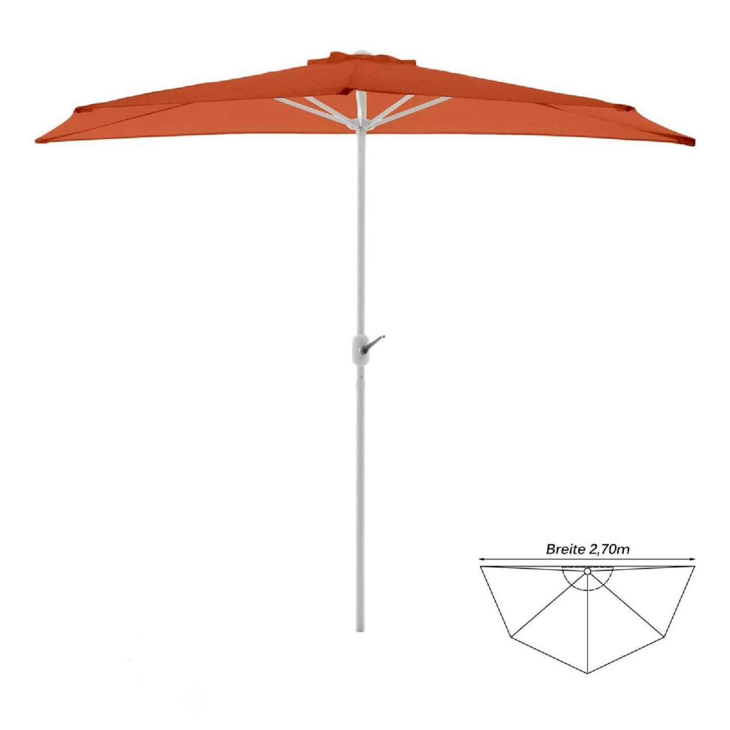 Halbrunder oranger Sonnenschirm, ideal für kleine Balkone und Terrassen. Der halbrunde Schirm lässt sich ganz einfach an der Hauswand ausrichten und bequem per Kurbel öffnen und schließen.