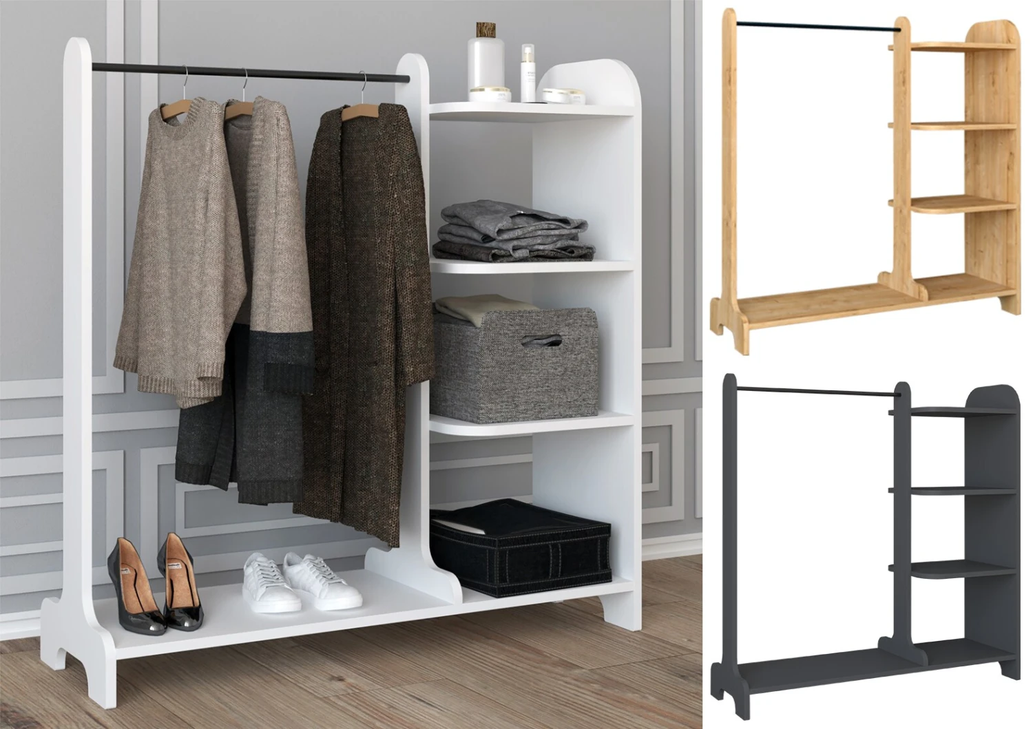 Das Regal „Lempu M“ ist ein absolutes Raumwunder, dass zusätzlich eine schöne Übersicht aller Kleidungsstücke bietet. Im Lieferumfang enthalten ist eine Kleiderstange für die praktische Ordnung mit Kleiderbügeln. Drei offene Fächer bieten weiteren Stauraum. Das Regal kann gedreht werden, womit die Regalfächer links oder rechts sein können, je nach den persönlichen Bedürfnissen.