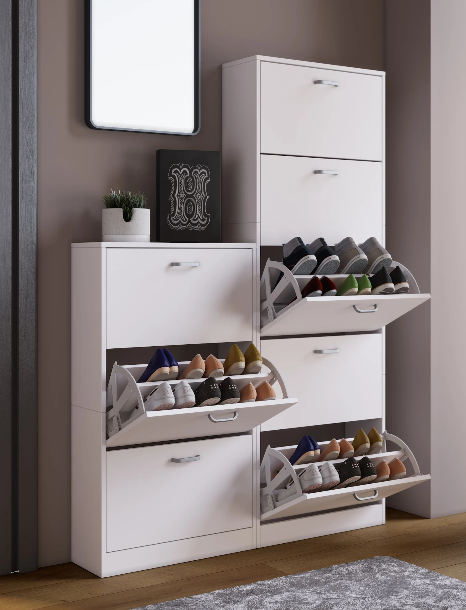 Der Schuhschrank „Sipos L“ ist ein kleines Raumwunder mit viel Stauraum. Jedes der drei Fächer hat eine Fachunterteilung, damit Sie Ihre Schuhe platzsparend und übersichtlich verstauen können.