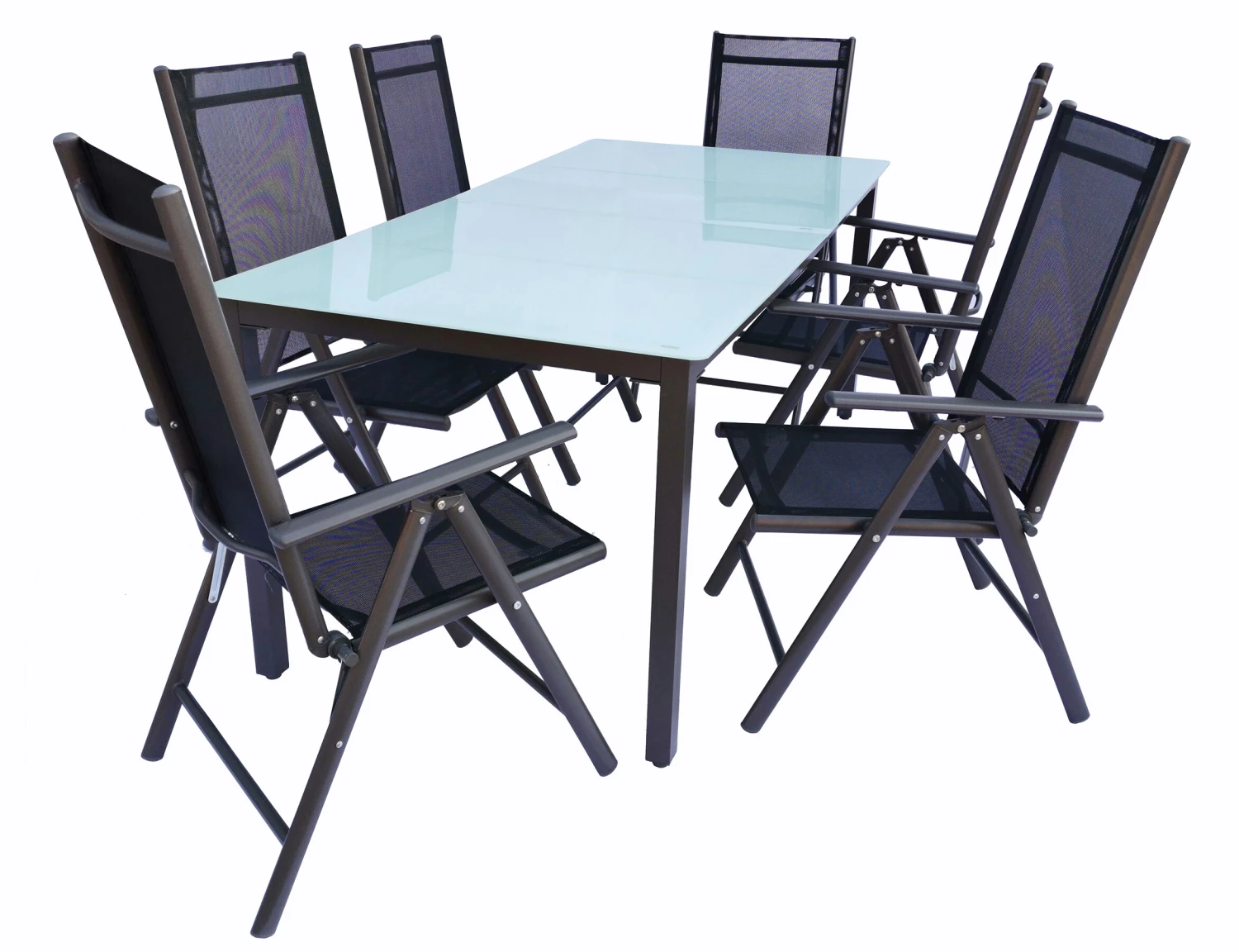 Die Möbel bestehen aus sehr hochwertigem Aluminium und sind damit äußerst wetter- und UV-beständig. Der robuste Tisch hat eine Platte aus Sicherheitsglas.