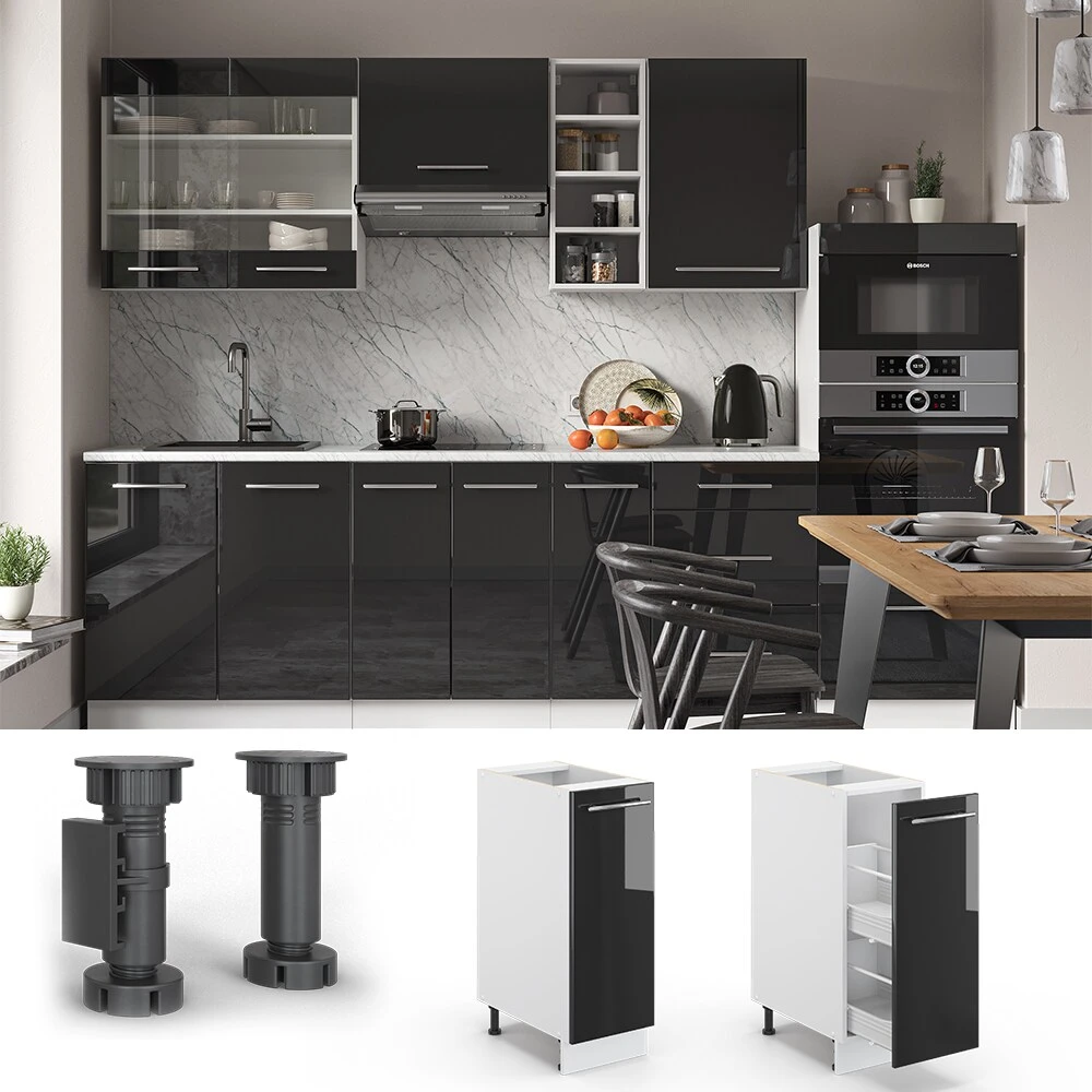 Die bequemen Softclose Scharniere bieten ein bequemes Handling und die hochwertigen Metalauszüge der Schubladen sorgen für eine lange Lebensdauer der Küchenmöbel. Die Schränke sind mit höhenverstellbaren Stellfüßen ausgestattet, dank denen sich Bodenunebenheiten mühelos ausgleichen lassen.