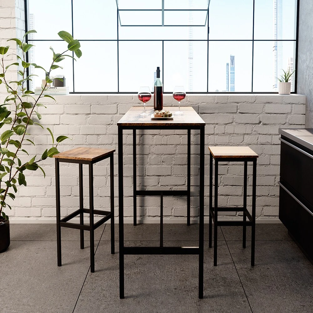 • Die Tischplatte in Antikholz-Optik bietet viel Platz und wirkt durch die luftige Rahmenkonstruktion dennoch leicht und modern.