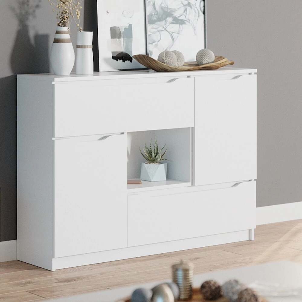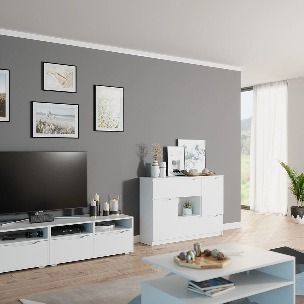 Das Sideboard unserer Serie Ruben wird Sie begeistern. Das moderne Design verbirgt viel Stauraum hinter seinen grifflosen Türen und Schubfächern.