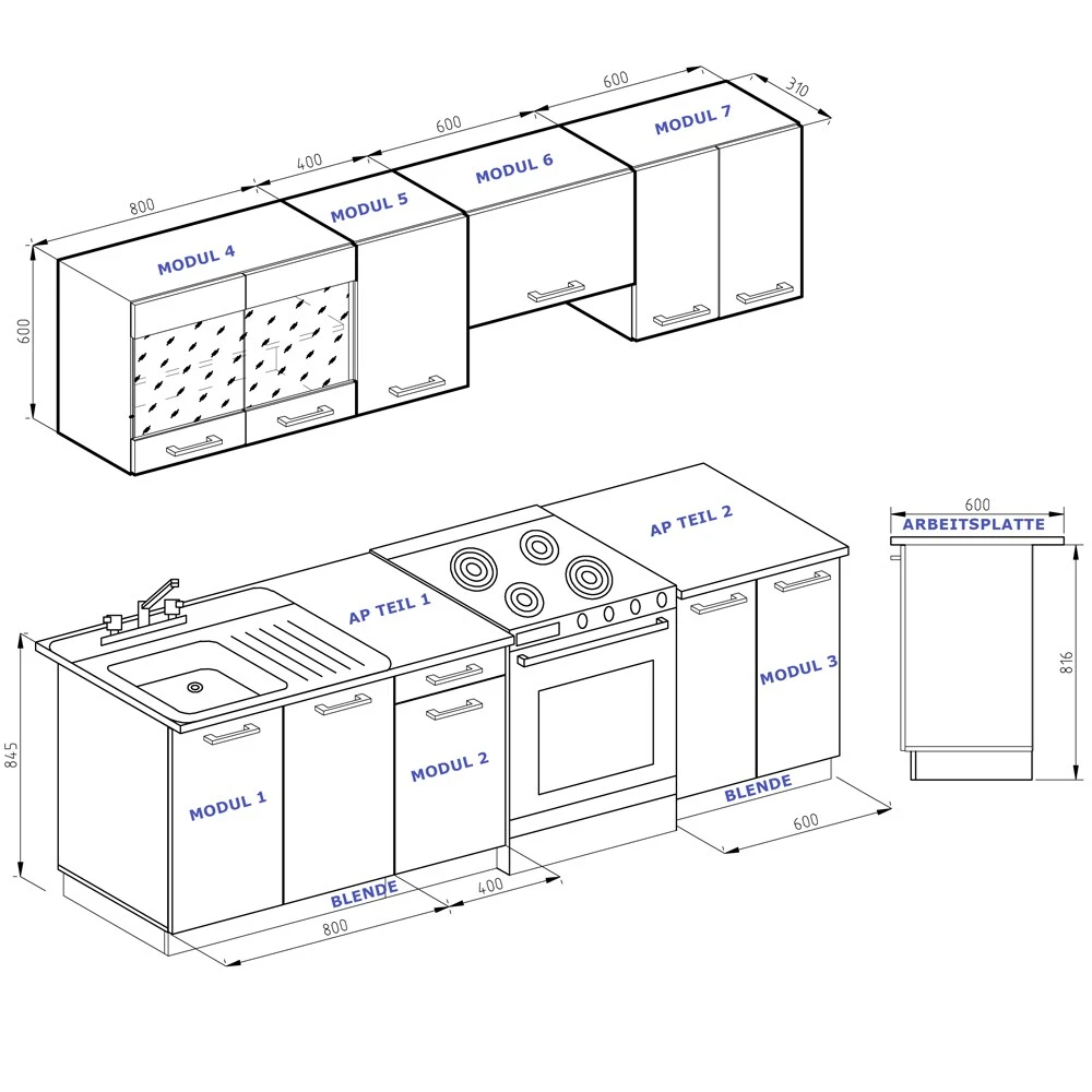 • Im Lieferumfang enthalten sind 7 einzelne Küchenschränke, 2 Arbeitsplatten, eine bebilderte und leicht verständliche Montageanleitung sowie die dazugehörigen Montagematerialien.