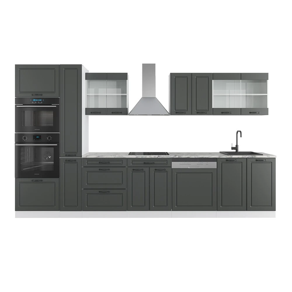 • Im Block ist sie 350 cm breit und benötigt daher nur wenig Stellfläche. Der Mikrowellenumbauschrank als höchstes Element hat eine Höhe von 207 cm und eine