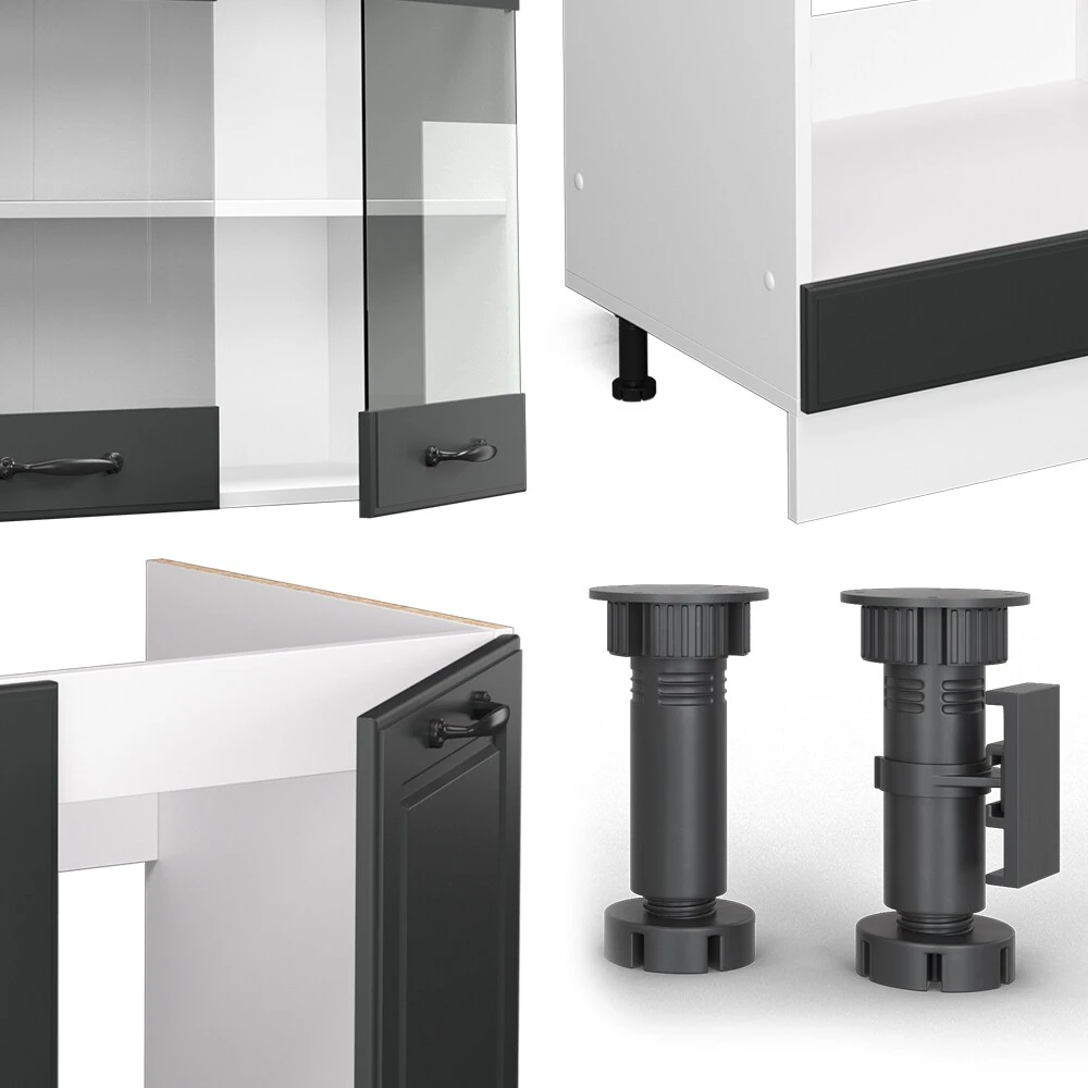 • Im Lieferumfang enthalten sind 13 einzelne Küchenschränke, eine bebilderte und leicht verständliche Montageanleitung sowie die dazugehörigen Montagematerialien.