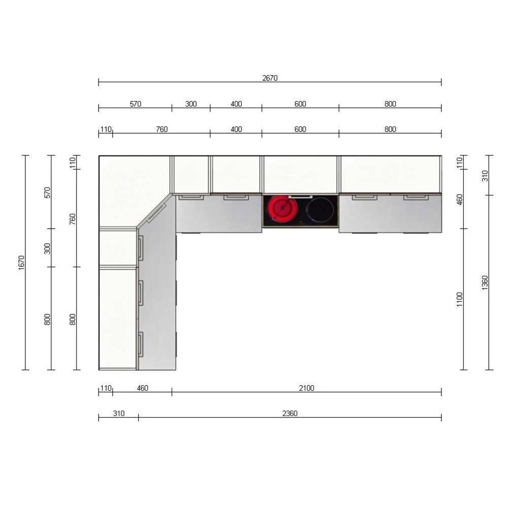 • Sie kann im Längenmaß 160 x 267 cm aufgestellt werden. Die Hängeschränke können bei dieser Küche individuell angebracht werden. Die Arbeitsplatten sind als tiefstes Element alle 60 cm Tief.