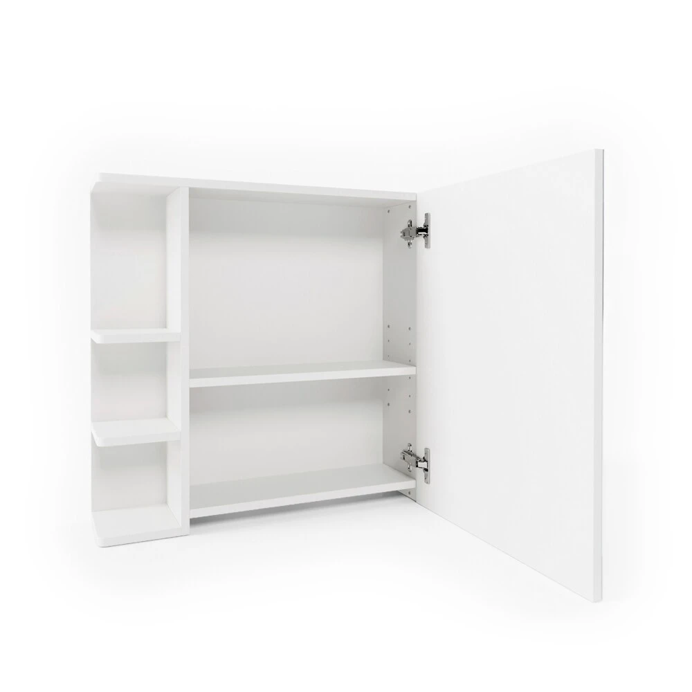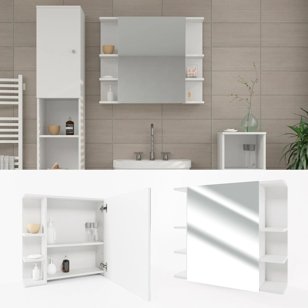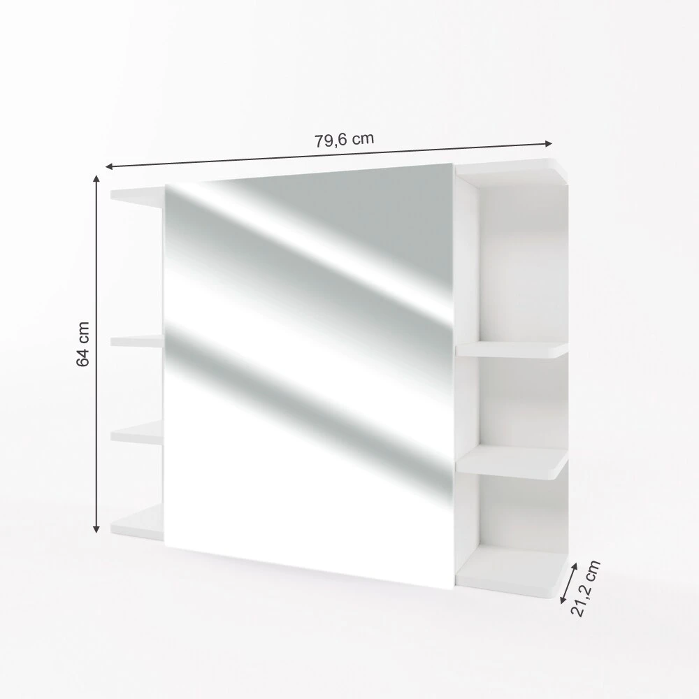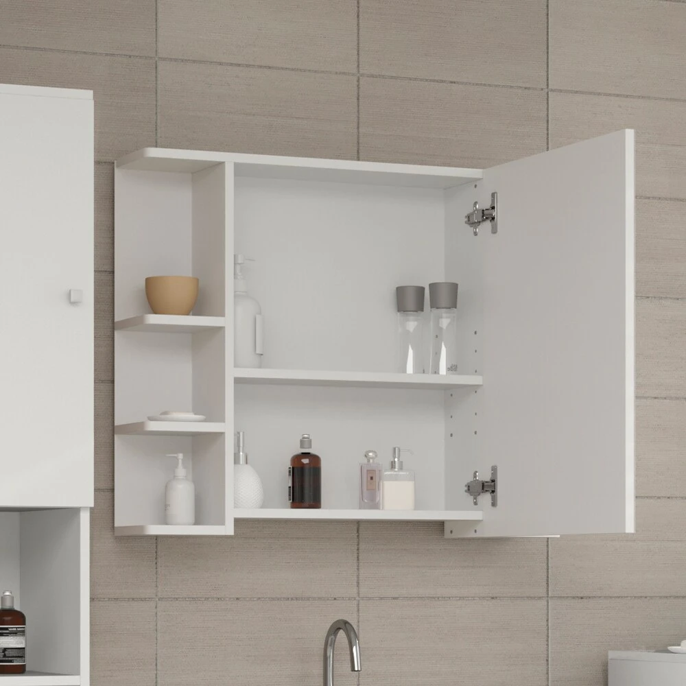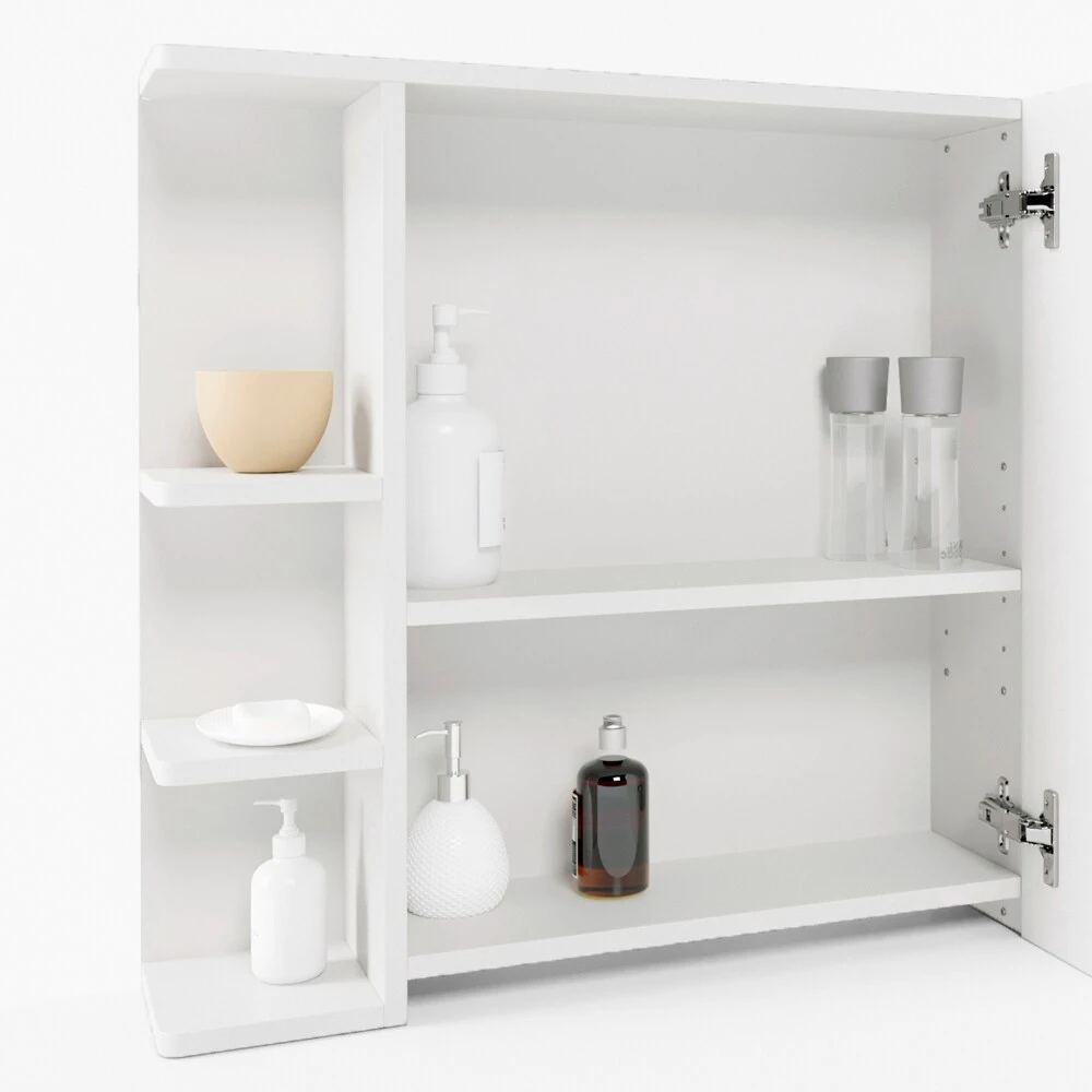 Neben dem geräumigen Innenfach, das horizontal durch ein höhenverstellbaren Einlegeboden geteilt werden kann, befinden sich links und rechts neben dem Spiegelfach zusätzlich je 3 Abstellflächen für kleinere Badutensilien.