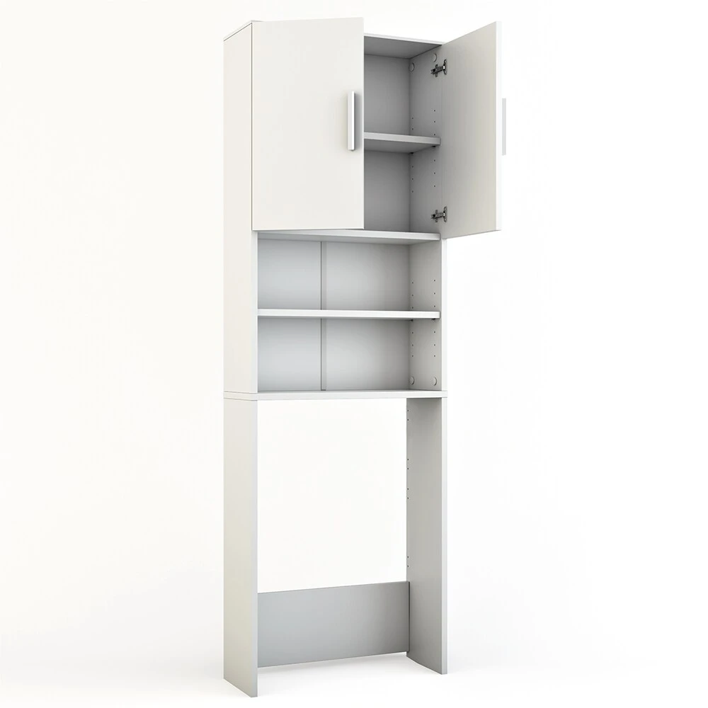 Der Umbauschrank bietet direkt über der Waschmaschine, hinter zwei Türen und in zwei offenen Ablagefächern, außerordentlich viel Platz für Wäsche, Reinigungsmittel, Pflegeartikel und andere nützliche Dinge.