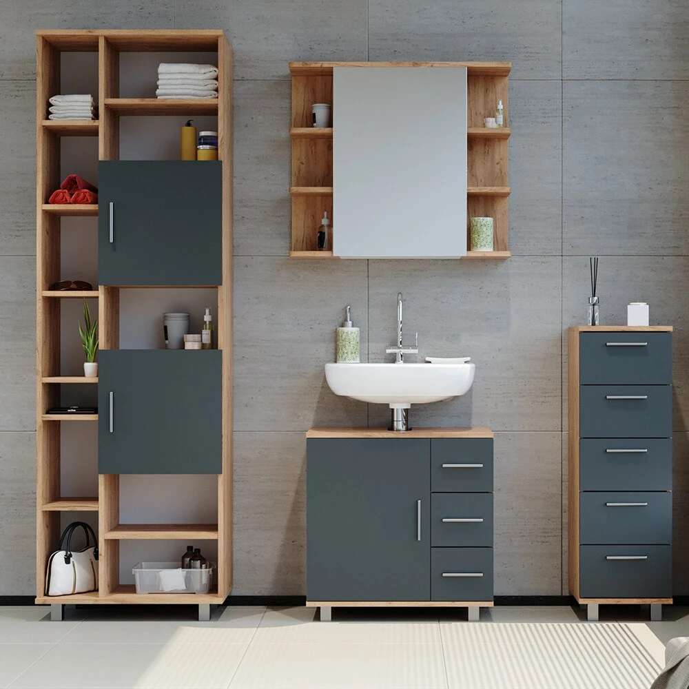 Unser Waschbeckenunterschrank bietet sehr viel Stauraum hinter der großen Tür und den drei Schubladen. Der pflegeleichte und feuchtigkeitsbeständige Badschrank ist mit Vollmetallscharnieren ausgestattet.