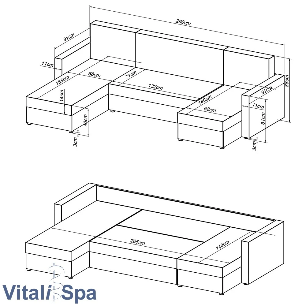 • Die Gesamtmaße betragen 290 x 61 x 185 cm (BxHxT).