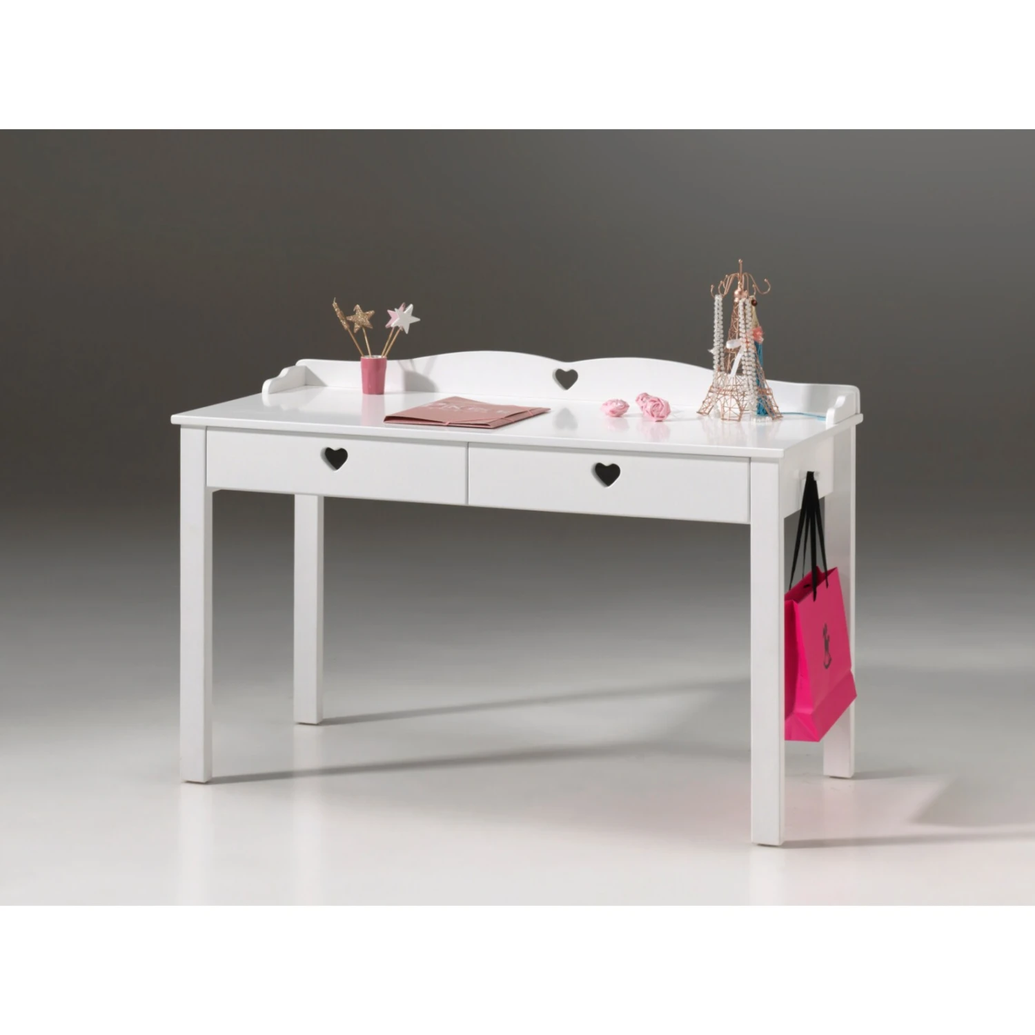 Sehr schöner Schreibtisch zum Programm Amori. Der Korpus besteht aus hochwertigem MDF und ist weiß lackiert. Die große Arbeitsfläche bietet viel Platz zum Schreiben und Spielen. Rückseitig ist ein geschwungenes Planeel aufgesetzt, das mittig einen herförmigen Ausschnitt hat und die Optik abrundet.