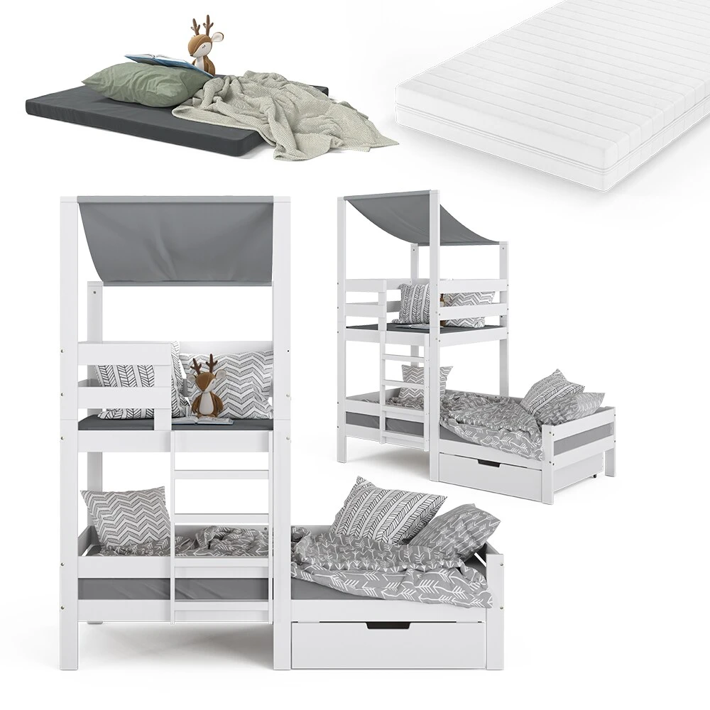 • Im Lieferumfang enthalten sind jeweils das Spielturmbett inkl. Lattenrost und Schublade, zwei Matratzen und eine bebilderte Montageanleitung sowie das benötigte Montagematerial.
