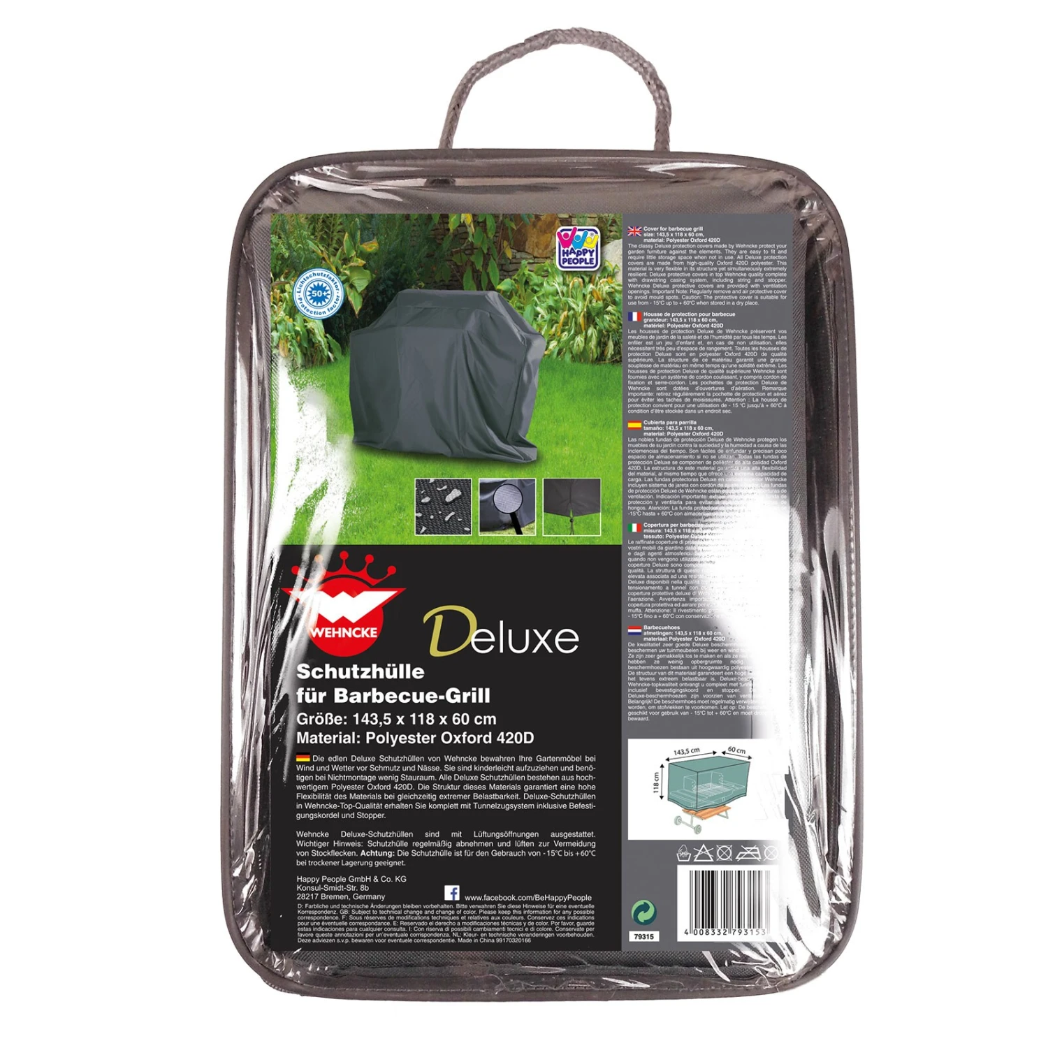 Diese edle Deluxe-Schutzhülle von Wehncke bewahrt Ihren Barbecue-Grill bei Wind und Wetter vor Schmutz und Nässe. Sie ist kinderleicht aufzuziehen und benötigt bei Nichtmontage nur wenig Stauraum. Die Hülle besteht aus hochwertigem Polyester Oxford 420 D. Die Struktur dieses Materials garantiert eine hohe Flexibilität der Schutzhüllen bei gleichzeitig extremer Belastbarkeit.