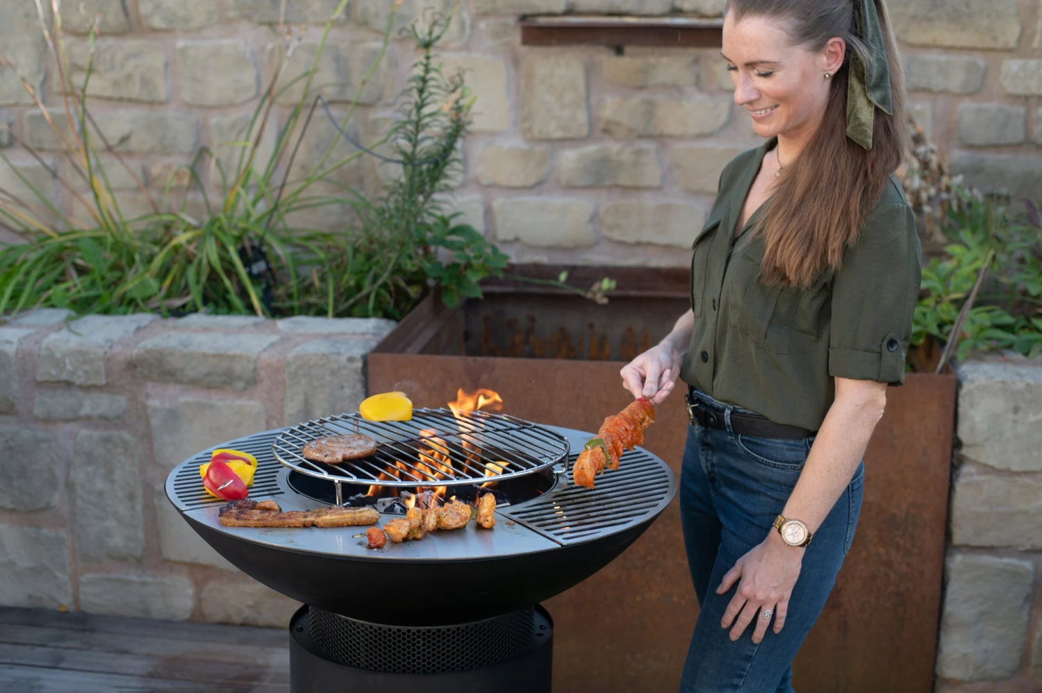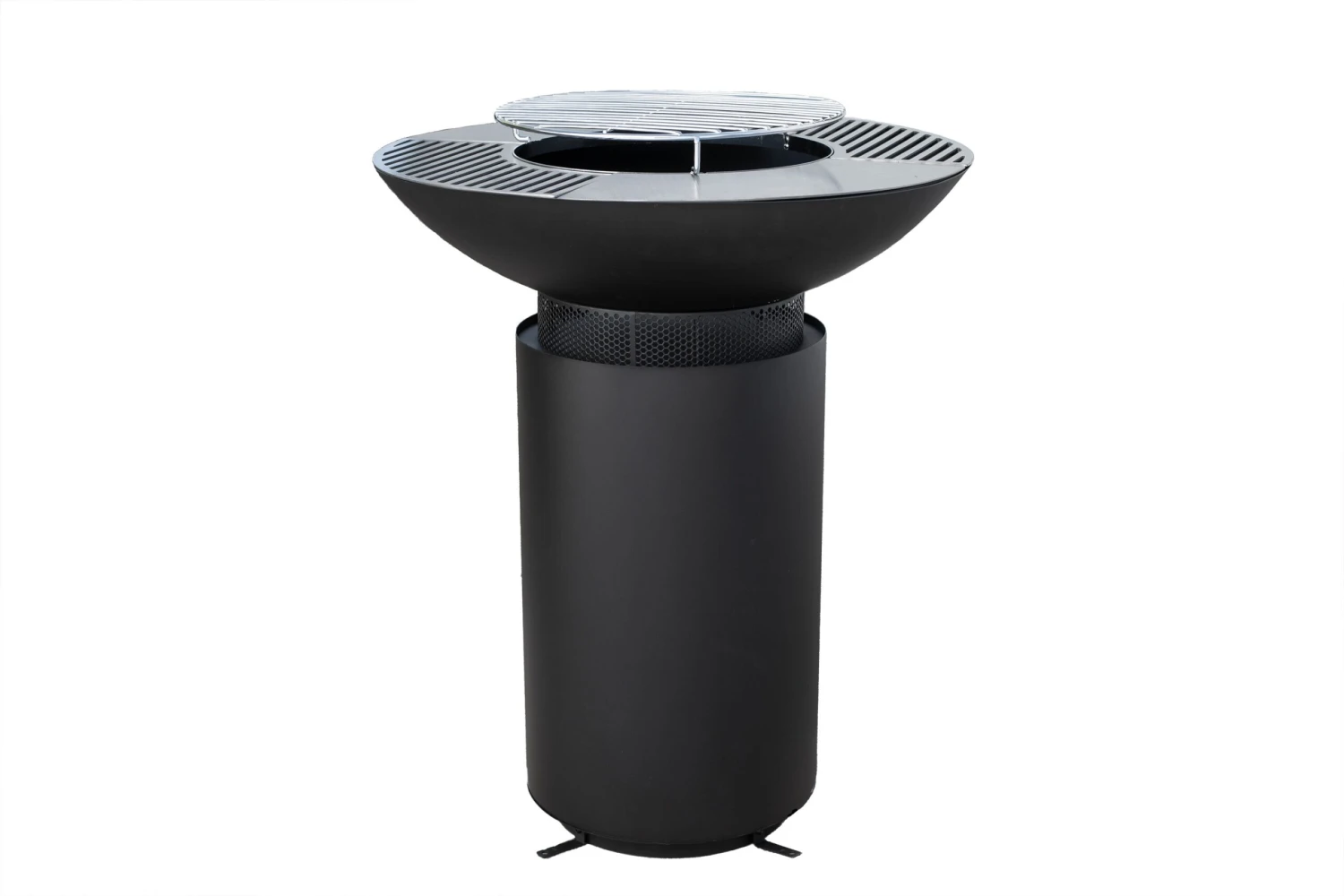 Der Westmann Grill im Stil einer Feuerschale wurde hergestellt aus pulverbeschichtetem, rostfreiem Stahl in Schwarz und überzeugt vor allem durch seine Stabilität und Witterungsbeständigkeit.