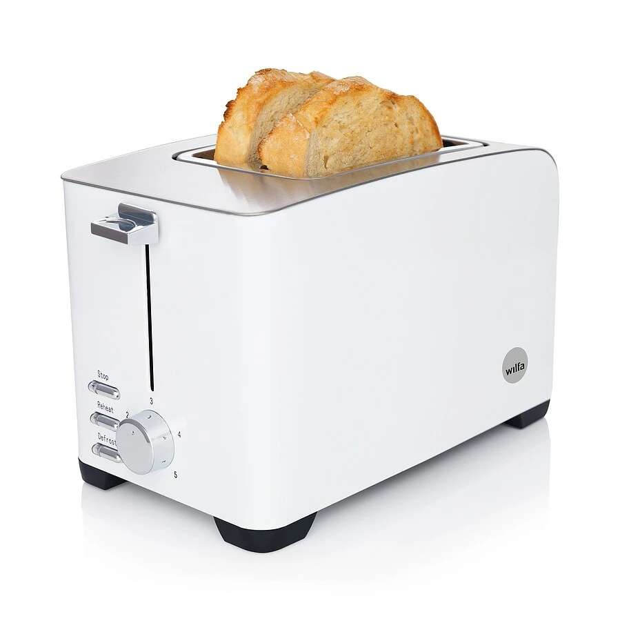 Der Wilfa Edelstahl Toaster überzeugt mit 5 Bräunungsstufen, um jedes Bedürfnis abzudecken und den Start in den Tag optimal zu gestalten. Selbst eingefrorene Brötchen stellen für den Toaster kein Problem dar, mit der Auftaufunktion sind diese im Nu aufgetaut. Die Aufwärmfunktion des Toasters ist super, wenn Sie Brötchen vom Vortag haben und diese wieder knusprig werden sollen. Auch die Reinigung des Toasters ist unkompliziert, da er über eine herausnehmbare Krümelschublade verfügt, die alle Krümel auffängt. Eine Hochstellfunktion sorgt für einen leichteren Zugriff auf das Brot. Der Toaster verfügt über eine Leistung von 800 Watt und dank der zwei extra großen Schlitze können Sie auch sehr dicke Scheiben problemlos toasten. Das elegante Design des Toasters aus rostfreiem Edelstahl ist ein absoluter Hingucker in jeder Küche.